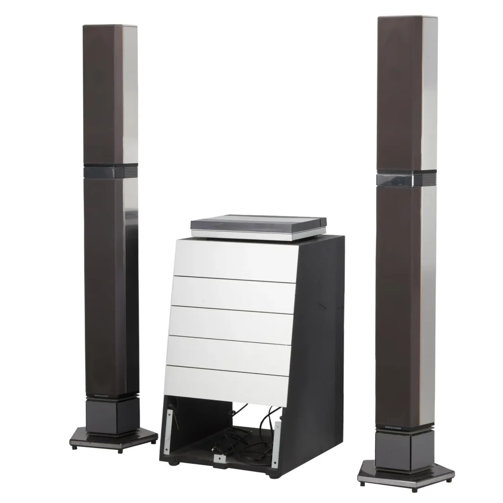 The first system comprised a sleek black and silver cabinet featuring fold-down doors that reveal a Beogram 5500 turntable, Beomaster 5500 tuner/amplifier, Beocord 5500 cassette deck, and Beogram CD 50 player. The system was controlled with a B&O Master Control Panel 5500, and a pair of Penta speaker towers.