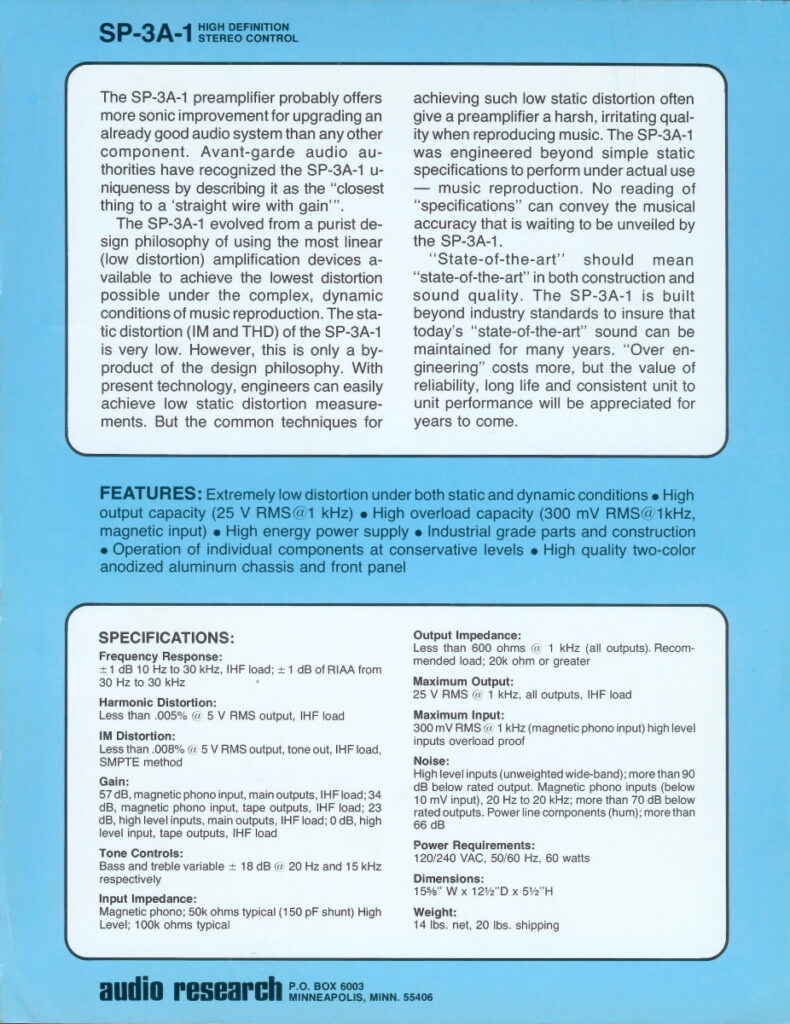The SP-3 was reviewed by two respected audio magazines, the Absolute Sound and Stereophile, shortly after it’s release. The Absolute Sound commented that the SP-3 was “…the best sounding preamplifier available in America today.” Stereophile described it as a “straight wire with gain”, suggesting that it neither added nor subtracted anything from the sound passing through it.