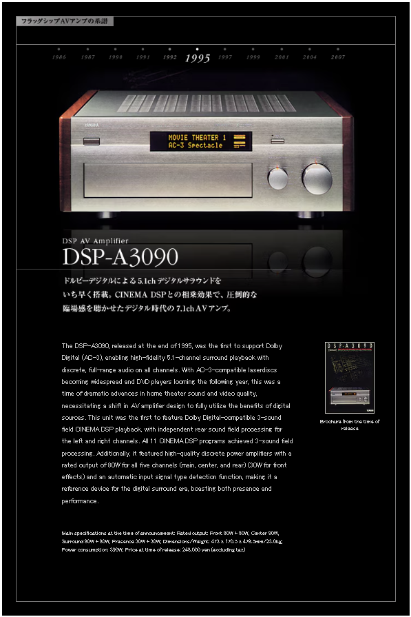 By 1995, Yamaha had been making home theatre amplifiers and receivers for many years, and the company had a lot of expertise in surround sound. When Dolby Labs made their AC-3 (Dolby Digital) technology available to manufacturers, Yamaha decided to equip the DSP-A3090 with three types of surround sound technologies: