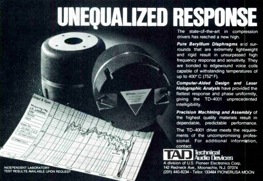A print advertisement for TAD’s TD-4001 compression driver with beryllium diaphragm