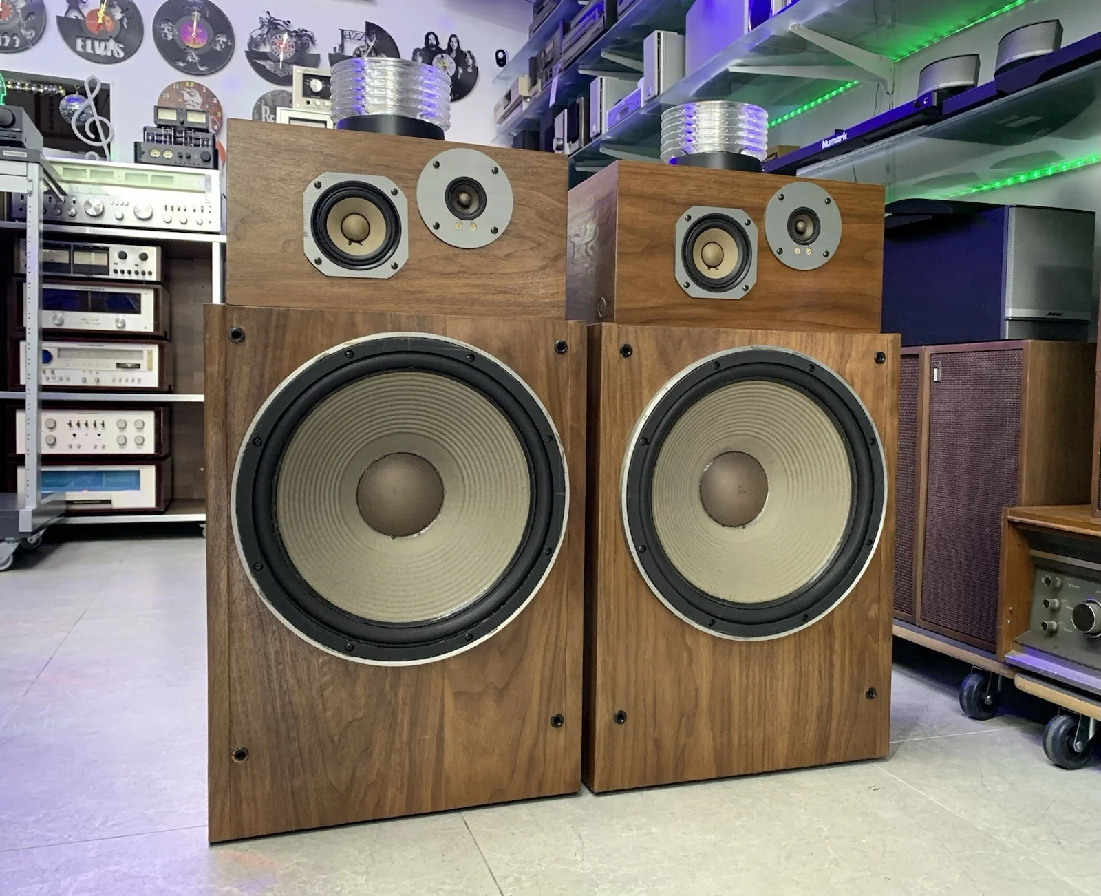 A pair of JBL D-50 “Olympus” speakers, using a pair of powerful woofers, midrange driver with acoustic lens, and a “bullet” tweeter